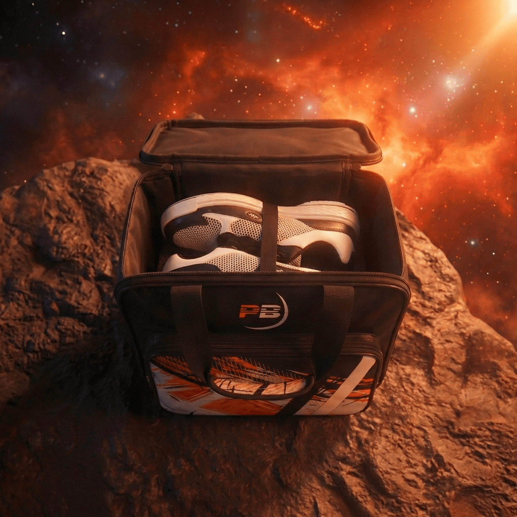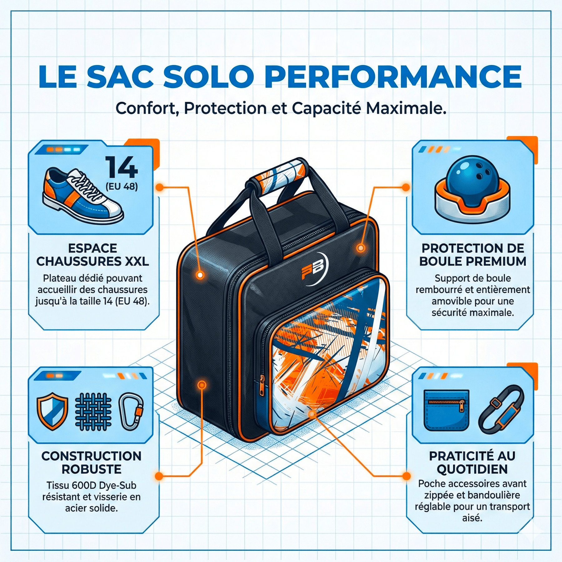 Această geantă single se concentrează pe esențial, rămânând în același timp foarte practică. Mingea este menținută datorită suportului căptușit detașabil, încălțămintea este depozitată pe un raft dedicat pentru a rămâne separată, iar buzunarul frontal cu fermoar găzduiește accesoriile dumneavoastră.